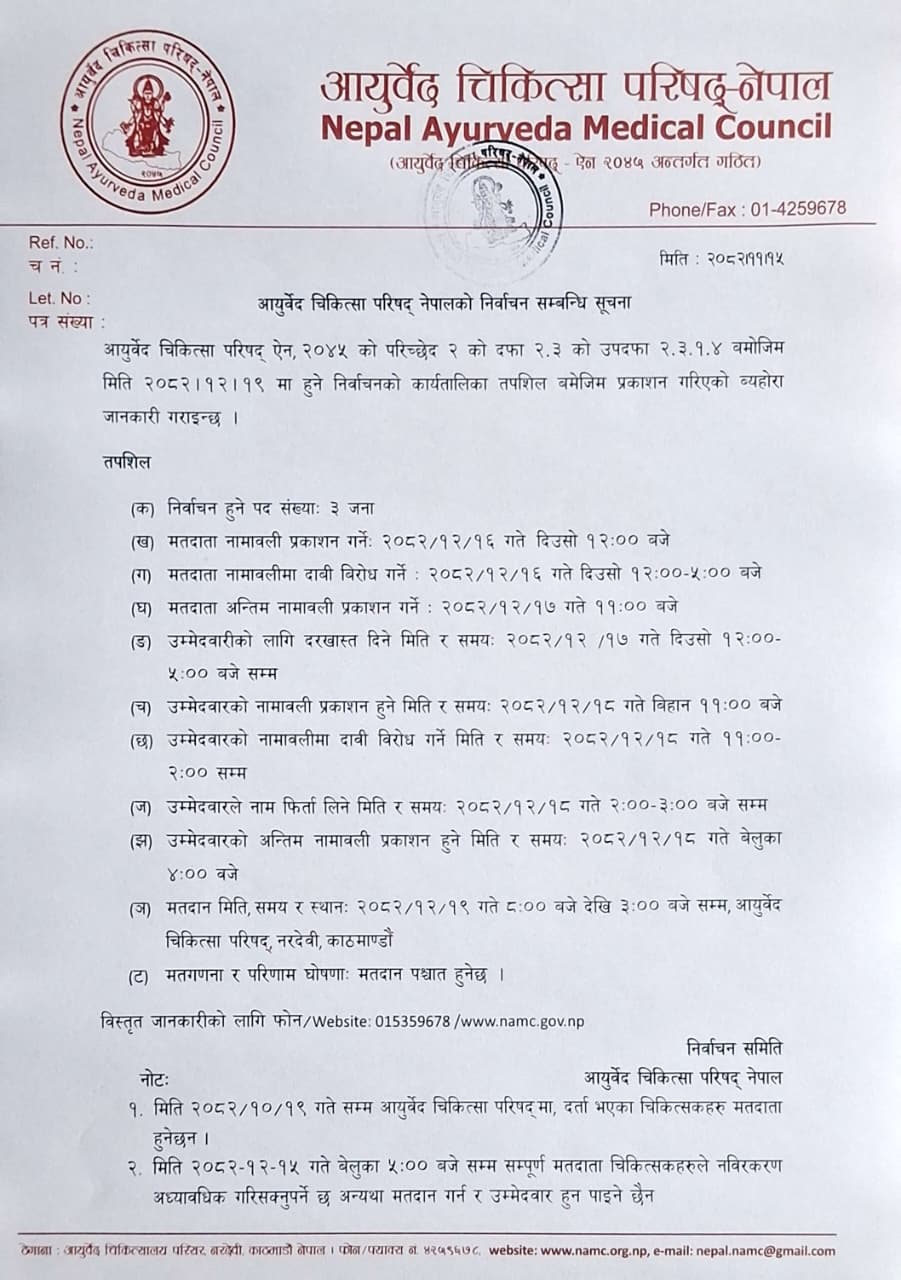 आयुर्वेद चिकित्सा परिषद नेपालको निर्वाचन सम्बन्धि सूचना