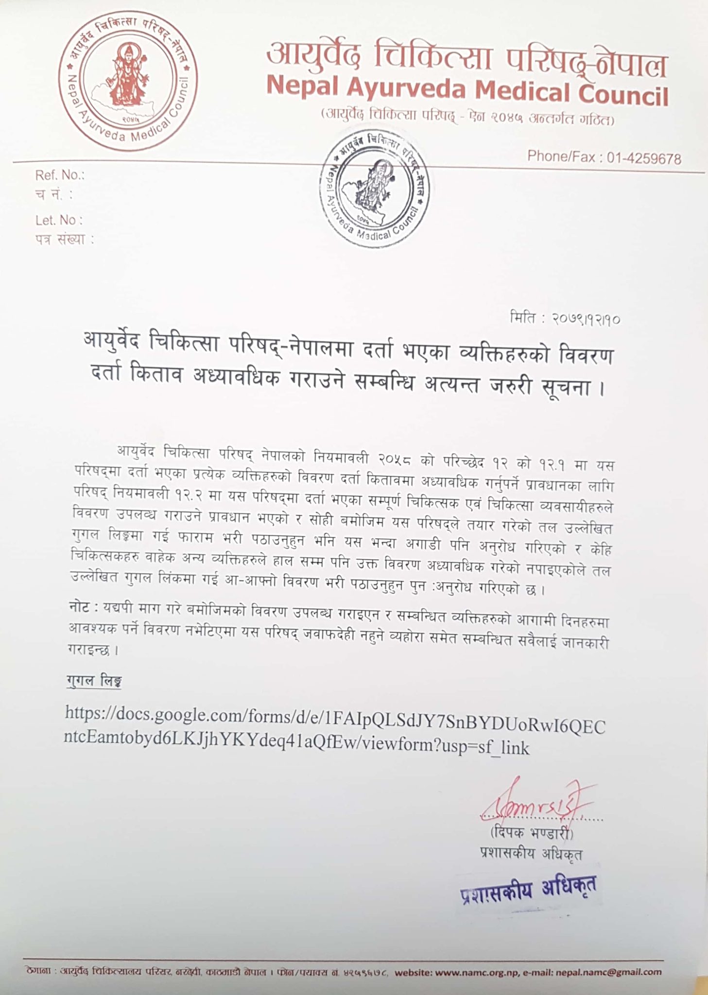 आयुर्वेद चिकित्सा परिषद नेपालको निर्वाचन सम्बन्धि सूचना
